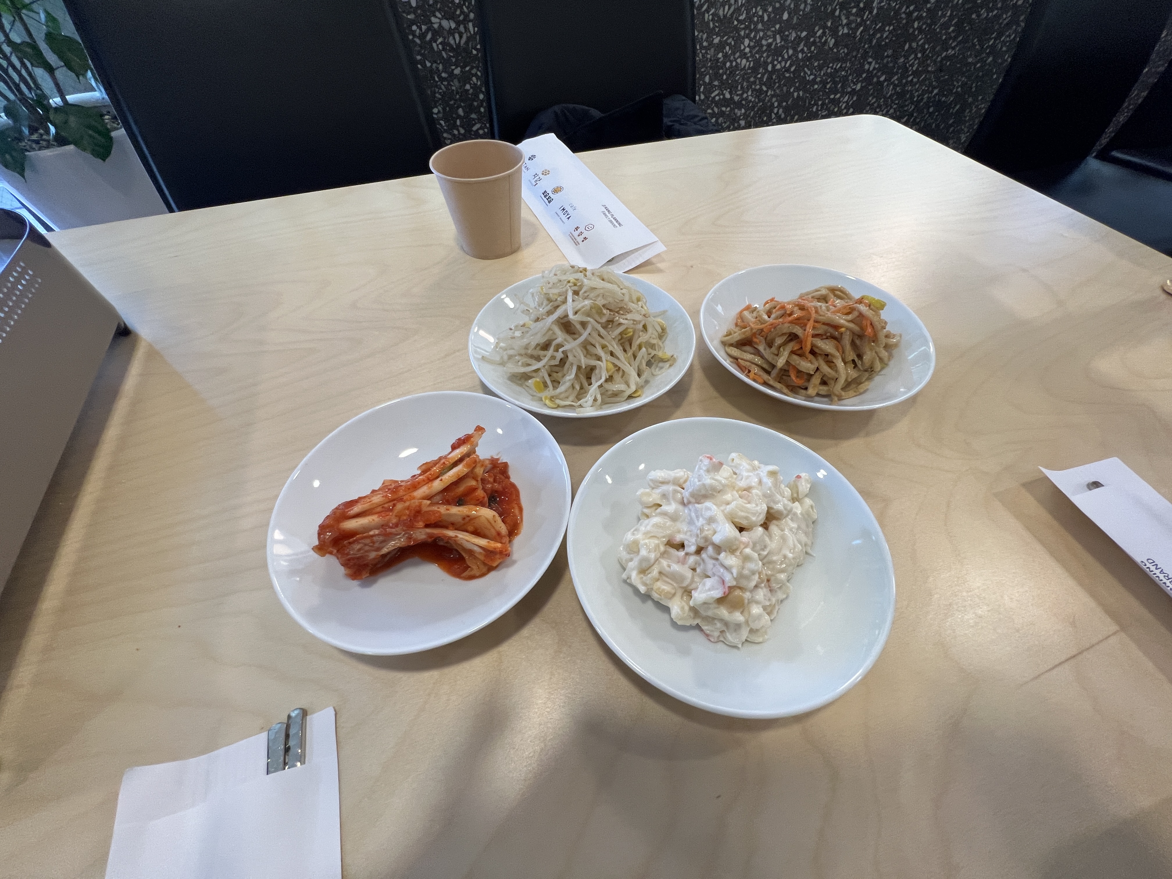 밑반찬은 콩나물, 김치, 마카로니, 어묵볶음입니다